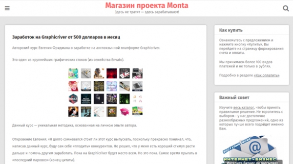 Что такое Graphicriver? Это сайт, который позволяет любому человеку легко продавать свои цифровые продукты. Без опыта, без трафика, без сложной настройки. В курсе описан подробный разбор как загружать цифровые продукты на данную площадку и зарабатывать на этом. В чем суть заработка в Graphicriver? Этот курс позволяет заработать на продаже созданный продуктов, имея при этом почти пассивный доход. В некоторых случаях (смотрите уроки курса) можно практически без затрат своего времени сделать себе быстро растущий доход. Аналогов таких курсов пока нет, поскольку мало кто делится подобной информацией. Золотая жила… Как на этом можно заработать и сколько? Доход от этого метода разный: многие топовые авторы зарабатывают от $5000-7000 в месяц. Супер топовые намного выше. Начинающие стабильно имеют 500 — $1000. Однако сначала нужно получить навыки, изучив курс. Волшебной кнопки не существует, существует данный курс. Курс сделан таким образом, чтобы каждый новичок смог, посмотрев уроки и проделав практику, научиться зарабатывать от $500 в месяц. При этом не имея особых навыков и талантов: уникальная авторская методика помогает в этом. Реально зарабатывать из любой точки мира, не зависеть от курса рубля, поскольку доход стабильно в долларах. Сколько нужно времени, чтобы реально во всем разобраться? Для новичка 1-2 недели для запуска и изучения системы. Для продвинутого пользователя, конечно, меньше. Что конкретно нужно делать? Краткая схема действий: — Создать по инструкции цифровой продукт (без опыта и навыков, просто делая то, что показывает автор в данном курсе) — Сделать упаковку (описание, картинка) — Придерживаться маркетинговой стратегии, изложенной в курсе — Загрузить первый продукт, потом следующие — Следить за продажами своего цифрового продукта — Вывести деньги на свой счет Про вывод средств в курсе есть отдельный урок. Смысл в том, что для вывода можно использовать не только PayPal . Автор рассказывает как это делается с помощью сервиса карты Payoneer. В доп. материалах есть ссылка на регистрацию в данном сервисе. Карта высылается после регистрации и заполнения данных в любую точку мира. Потом вывести можно на данную карту через Graphicriver (как это делается есть отдельный урок по выводу). Снять деньги можно в любой точке мира.