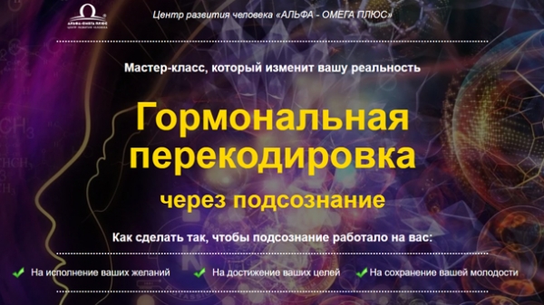 Программа Мастер-класса: День 1 Гормональная перекодировка через подсознание [Медитация] Точка входа в подсознание. Как определить, что вы уже там? Как общаться с подсознанием через образы [Практика] Поворот времени вспять через гормональное перепрограммирование подсознания [Практика] Закладка образов гормональной перестройки для восстановления баланса гормонов и изменения химического состава мозга [Практика] Установка в подсознание программы на долгую жизнь День 2 [Эксклюзив!] Энергетическая косметология [Премьерная практика] Перекодировка крема: сонастройка с биоэнергетическим каркасом живого материала (плазмы) зарядка лазерным излучением мозга на омоложение В результате вы получите энергетически активный крем, благодаря которому в коже будут мгновенно запускаться омолаживающие процессы. Обратите внимание, что для работы вам необходимо будет приготовить гелеобразный крем (не молочко, не лосьон, не плотный крем, а гель — например, алоэ вера). Его состав не имеет значение — важна только гелеобразная текстура.
