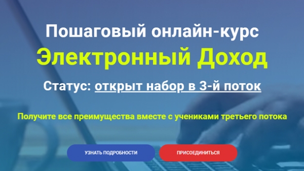Как проходит обучение: Получение материалов (мгновенно) Вы получаете сразу все материалы курса прямо на почту. Изучение курса (~60-90 минут) Внимательно просматриваете инструкцию и несколько видео-уроков. Просмотреть курс можно в любое удобное время. Письмо в поддержку (~1 минута) После просмотра курса — напишите об этом сообщение в службу поддержки. Пример: «Я ознакомился с инструкцией. Готов начинать». Начало работы по курсу (~1-2 дня) Делаете свои первые шаги по курсу «Электронный Доход». Просто повторяете за автором по готовой инструкции. Помощь и подсказки от поддержки Во время выполнения инструкции с вами свяжется один из сотрудников службы поддержки. Он посмотрит на ваши результаты и подскажет что делать дальше. После этого вы будете знать всё что нужно для начала заработка. Заработок по курсу Электронный Доход Теперь вы знаете абсолютно всё про заработок. Далее вы приступаете к заработку и выводите свои первые деньги.