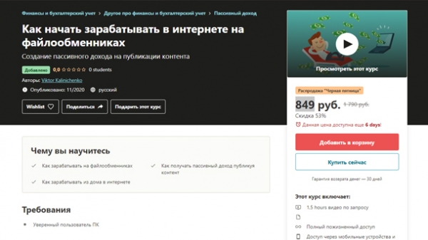 Если вы ищете возможность удаленного заработка, работы из дома, дохода в интернете без специальных знаний и навыков, то этот курс для вас.   На нем вы научитесь получать стабильный пассивный доход за счет загрузки различного контента на файлообменные сервисы и публикации ссылок на данный контент на форумах.   Вам будет оплачивать файлообменник за каждое скачивание вашего файла или за продажу премиум аккаунта на их сервисе.