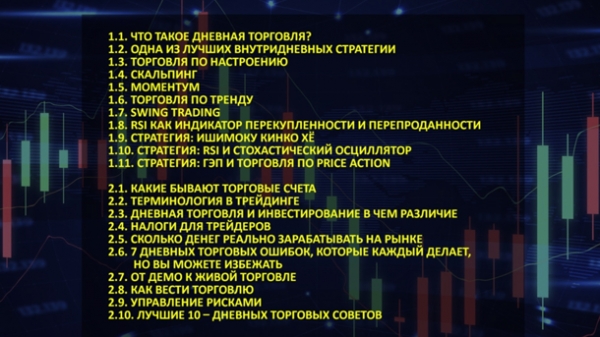 Day Trading. Дневная торговля. Forex. Акции. Криптовалюта. Добро пожаловать на курс «Day Trading. Дневная торговля. Forex. Акции. Криптовалюта.»! Курс научит прибыльно торговать на рынке форекс, акций и криптовалюты.   УРОКИ КОТОРЫЕ РАССМОТРИМ В ЭТОМ КУРСЕ:   1.1. ЧТО ТАКОЕ ДНЕВНАЯ ТОРГОВЛЯ? 1.2. ОДНА ИЗ ЛУЧШИХ ВНУТРИДНЕВНЫХ СТРАТЕГИИ 1.3. ТОРГОВЛЯ ПО НАСТРОЕНИЮ 1.4. СКАЛЬПИНГ 1.5. МОМЕНТУМ 1.6. ТОРГОВЛЯ ПО ТРЕНДУ 1.7. SWING TRADING 1.8. RSI КАК ИНДИКАТОР ПЕРЕКУПЛЕННОСТИ И ПЕРЕПРОДАННОСТИ 1.9. СТРАТЕГИЯ: ИШИМОКУ КИНКО ХЁ 1.10. СТРАТЕГИЯ: RSI И СТОХАСТИЧЕСКИЙ ОСЦИЛЛЯТОР 1.11. СТРАТЕГИЯ: ГЭП И ТОРГОВЛЯ ПО PRICE ACTION 2.1. КАКИЕ БЫВАЮТ ТОРГОВЫЕ СЧЕТА 2.2. ТЕРМИНОЛОГИЯ В ТРЕЙДИНГЕ 2.3. ДНЕВНАЯ ТОРГОВЛЯ И ИНВЕСТИРОВАНИЕ В ЧЕМ РАЗЛИЧИЕ 2.4. НАЛОГИ ДЛЯ ТРЕЙДЕРОВ 2.5. СКОЛЬКО ДЕНЕГ РЕАЛЬНО ЗАРАБАТЫВАТЬ НА РЫНКЕ 2.6. 7 ДНЕВНЫХ ТОРГОВЫХ ОШИБОК, КОТОРЫЕ КАЖДЫЙ ДЕЛАЕТ, НО ВЫ МОЖЕТЕ ИЗБЕЖАТЬ 2.7. ОТ ДЕМО К ЖИВОЙ ТОРГОВЛЕ 2.8. КАК ВЕСТИ ТОРГОВЛЮ 2.9. УПРАВЛЕНИЕ РИСКАМИ 2.10. ЛУЧШИЕ 10 – ДНЕВНЫХ ТОРГОВЫХ СОВЕТОВ