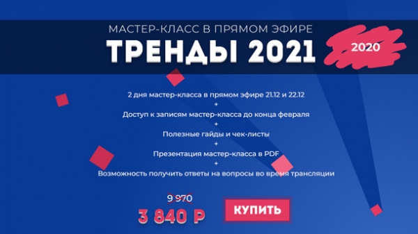2 дня мастер-класса в прямом эфире 21.12 и 22.12 + Доступ к записям мастер-класса до конца февраля + Полезные гайды и чек-листы + Презентация мастер-класса в PDF