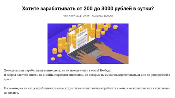 Хочешь начать зарабатывать в интернете, но не знаешь с чего начать? Не беда! Я собрал для тебя список из 41 сайта с кратким описанием, на которых ты сможешь зарабатывать от 200 до 3000 рублей в сутки!   На некоторых из них я зарабатывал раньше, когда также только начинал работать в сети, а несколько из них я использую до сих пор.   Некоторые из них простейшие и интуитивно понятные — могут зарабатывать даже новички, а есть чуть посложнее — ты сможешь выбрать себе любой или даже несколько, которые тебе понравятся. Из них есть сайты, где ты сможешь зарабатывать уже сегодня.   Уже несколько лет я успешно зарабатываю в сети разными способами и этот гайд я готовил для тебя 3 недели. Кто я такой — можешь почитать здесь.   Изучив данные сайты и выбрав для себя один или несколько, ты сможешь со временем уйти с основной работы и работать дома по свободному графику, как это однажды сделал я. Ведь это очень удобно. Сразу скажу, что это не какие-то хайпы, ставки, форексы и сетевой маркетинг — таких сайтов нет! К 39 сайтам есть от 1 до 4 видео с описанием как зарабатывать, а к двум ссылки на отзывы.   Не теряй времени и меньше думай — когда то же надо начинать! А то так и будешь дальше терять время впустую. Цену специально сделал недорогую.