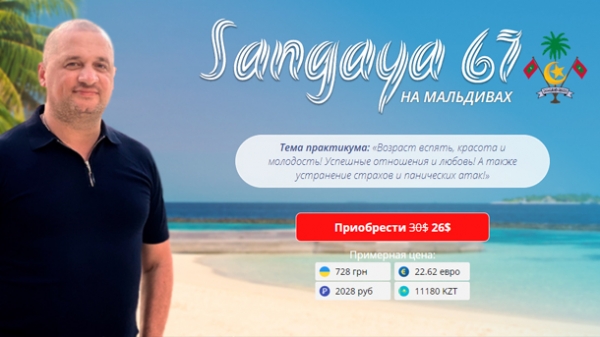 НА МАЛЬДИВАХ Прекрасная обстановка великолепных Мальдивских островов вызывает у нас естественное желание и мечту о бесконечном счастье. Удивительная природа этого уголка земли с тропическими растениями, музыкой прибоя, пением птиц и потрясающе красивыми закатами создают волшебную атмосферу, забыть которую невозможно! Именно здесь Андрей Дуйко проведет новое вдохновляющее сангая-занятие, посвященное красоте и молодости, успешным отношениям и любви. Вы запрограммируете себя на семейное счастье и материальное благополучие, устраните страхи и панические атаки, повернете время вспять! Этот практикум привлечет в Вашу жизнь процветание и удачу, подарит везение, вернет очарование и душевное тепло. Ваши отношения наполнятся любовью, радостью, и чувством приятного комфорта!