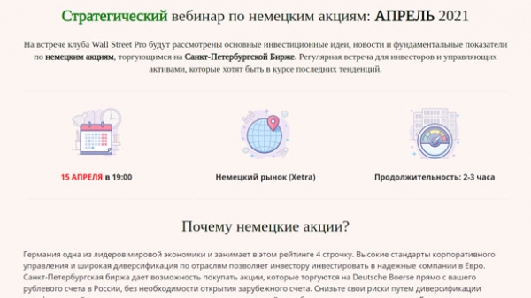 Почему немецкие акции?   Германия одна из лидеров мировой экономики и занимает в этом рейтинге 4 строчку. Высокие стандарты корпоративного управления и широкая диверсификация по отраслям позволяет инвестору инвестировать в надежные компании в Евро. Санкт-Петербургская биржа дает возможность покупать акции, которые торгуются на Deutsche Boerse прямо с вашего рублевого счета в России, без необходимости открытия зарубежного счета. Снизьте свои риски путем диверсификации портфеля акций через активы, номинированные в евро и получайте стабильные дивиденды из сердца Европы.   На данной встрече мы рассмотрим:   Германский рынок – зачем он нам вообще нужен? Особенности налогообложения дивидендов немецких компаний Сектора и акции, которые покрывает Санкт-Петербургская Биржа. Планы развития Результаты за 2020 год и краткая справка о самих компаниях (чтобы вы познакомились с ними) Инвестиционные идеи. Что еще стоит купить, когда рынки на максимумах? Мой портфель немецких акций. Почему выбрал именно эти компании ETF на немецкие акции для пассивного инвестора Блок ответов на ваши вопросы