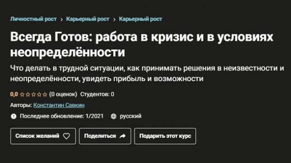 Курс «Всегда Готов: работа в кризис и в условиях неопределённости» направлен на развитие компетенций и навыков принятия решения и управления в условиях неопределённости и неизвестности, ограничения информации, стресса и кризиса. Мой курс максимально практический и адаптированный под текущие условия, с которыми столкнулись сотрудники и руководители многих компаний. На курсе «Всегда Готов: работа в кризис и в условиях неопределённости»», я расскажу: Как подготовиться к неизвестности и неопределённости? Как раскрыть свой потенциал и увидеть возможности в неизвестности? Какие тренды будут происходить в обществе при растущей неопределённости? Как принимать решения и нести ответственность в условиях непрогнозируемого кризис? Как оценить начальные условия, в которых мы с вами находимся, понять свои ресурсы? Ответы на эти вопросы и многие другие вопросы будут носить характер «формул», в которые вы сможете заложить свои условия и переменные, что даст вам возможность научиться анализировать и делать выводы. Курс «Всегда Готов: работа в кризис и в условиях неопределённости» полностью построен на практических рекомендациях и советах, которые вы можете легко адаптировать для решения своих задач. В процессе курсы мы создаём и разбираем различные ситуации в области неопределенности; учимся понимать их с точки зрения статуса наблюдателя, что позволят нам научить адаптироваться к условиям, в которых мы оказались. Мы сформируем систему из трёх проекций: Что делает нас результативными в условиях неопределенности? Как построить свою систему по работе в неопределенности? Что такое ситуативное управление при неопределенности? *** ПРОГРАММА КУРСА *** Вступление. Неизвестность и неопределённость в текущей ситуации. Какие профессии появятся после кризиса. Оценка начальных условий. Статус наблюдателя, бизнес-кейс Титаник. Как войти в статус наблюдателя. Развитие адаптации в условиях неопределенности. Что нужно развивать в себе и как подготовиться к неопределенности. Как найти целевую аудиторию для снижения неопределенности в своей жизни. Заключение.