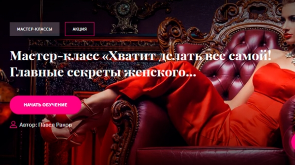 Где грань между успешной женщиной и стальной бабой? Вся правда в мастер-классе от психолога и эксперта в отношениях Павла Ракова! Рекомендуется к просмотру девушкам, которые: Привыкли к независимости — добиваются всего сами и думают, что мужчина — лишний груз, Являются лидерами по жизни, Устали строить карьеру и хотят простого женского счастья, Хотят знать, что такое женский успех и как раскрыть женственность. Темы мастер-класса: Что такое женский успех и как его добиться, не жертвуя собой, Как раскрыть лидерский потенциал, оставаясь при этом женщиной, Ключевая роль мужчины в жизни женщины, Как эффективно оказывать влияние на мужчину, чтобы привести его к успеху и богатству, Как убирать у мужчин страхи, мотивировать и вдохновлять их, Что такое активная жизненная позиция и как ее развить, Как стать финансово независимой от своего мужчины. Результаты обучения: Узнаете, чем женский успех отличается от мужского, Отдадите мужчине «пальму первенства» и возможность самостоятельно принимать решения, при этом как «серый кардинал», грамотно направляя его, Научитесь достигать успеха через мужчину, его победы и достижения, сохраняя при этом самодостаточность, Узнаете, как из любого мужчины рядом с вами сделать миллионера.