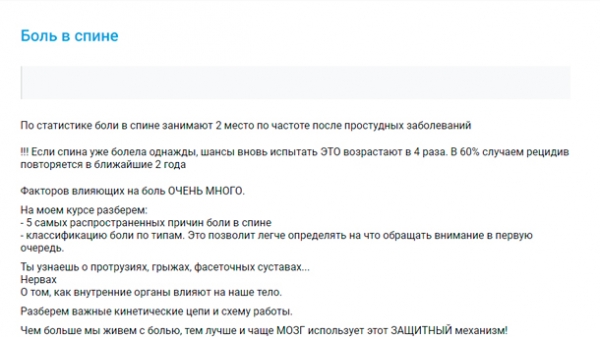 ‍По статистике боли в спине занимают 2 место по частоте после простудных заболеваний ⠀  !!! Если спина уже болела однажды, шансы вновь испытать ЭТО возрастают в 4 раза. В 60% случаем рецидив повторяется в ближайшие 2 года ⠀  Факторов влияющих на боль ОЧЕНЬ МНОГО.   На моем курсе разберем: — 5 самых распространенных причин боли в спине — классификацию боли по типам. Это позволит легче определять на что обращать внимание в первую очередь.   Ты узнаешь о протрузиях, грыжах, фасеточных суставах… Нервах О том, как внутренние органы влияют на наше тело.   Разберем важные кинетические цепи и схему работы.   Чем больше мы живем с болью, тем лучше и чаще МОЗГ использует этот ЗАЩИТНЫЙ механизм! И тем меньше движения мы будем делать в тех зонах, где есть боль   Таким образом запускается «ПОРОЧНЫЙ КРУГ». Боль-обездвиживание-спазм-отек-боязнь движения-изменение стереотипа движения-большая боль…   Как быть и что делать? Разберем на моем видео курсе.