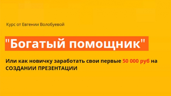 БЕЗ ВЛОЖЕНИЙ Начать зарабатывать вы сможете абсолютно без вложений денег БЕЗ ОПЫТА И ЗНАНИЙ Не обязательно иметь опыт по созданию презентации БЕЗ ПРОБЛЕМ Мы научим вас создавать презентации по готовым шаблонам Что нужно делать? Зарегистрироваться в программе (бесплатно). Создать презентацию по быстрым шаблонам. Отправить заказчику готовую презентацию. Получить деньги на карту или эл. кошелек. Сколько можно заработать? Вы можете создать простую школьную презентацию, которая будет стоить от 500 до 1000 рублей. А можете создать более сложную презентацию для экспертов и спикеров, которая будет стоить от 2000 до 20.000 рублей. И даже не переживайте, что у вас не получится создавать такие презентации. Там нет ничего сложного! Я записала для вас подробные уроки и подобрала готовые шаблоны, которые останется переделать под себя и получить за это ДЕНЬГИ! Меня зовут Евгения Волобуева. Я в Вконтакте: https://vk.com/id548131087 Я тестирую различные методики заработка лично на себе и с радостью делюсь полученными результатами. Скажу честно, за 4 года я успела перепробовать много разных методик. И когда мне попадается действительно рабочая система заработка, я обязательно делюсь ею со своими учениками. Но не просто делюсь, а помогаю начать зарабатывать. Сегодня я рассказываю вам о своем новом курсе «Богатый помощник», который поможет вам выйти на доход от 1000 рублей в день сразу же после изучения курса! В курсе я покажу вам 10 способов поиска клиентов по которым работаю сама. А так же раскрою секрет как найти первого клиента на следующий день! Я раскрою вам все секреты по профессиональному оформлению презентаций. Поделюсь с вами фишками, которые упростят вашу работу на 50%. Вы сможете работать как фрилансер в удобное для вас время, а можете работать с агентством по договору и получать оклад. В процессе обучения вы уже создадите свое портфолио с работами, которые сможете продать за 1000 рублей.