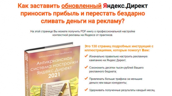Содержание книги Часть 1 (азы и полный цикл действий) 1. Основы контекстной рекламы в Яндекс Директ 2. Виды контекстной рекламы 3. Основные показатели эффективности рекламы 4. Алгоритм создания рекламного проекта в Яндекс Директ: — Шаг 1. Анализ продукта рекламы и аудитории его покупателей — Шаг 2. Сбор и обработка ключевых фраз — Шаг 3. Настройка параметров рекламной кампании — Шаг 4. Создание объявлений — Шаг 5. Назначение ставок — Шаг 6. Модерация — Шаг 7. Первые дни после запуска рекламы — Шаг 8. Улучшение качества приходящего трафика Часть 2 (подход для интернет-магазина) 1. Максимум Целевых действий: — Этап 1. Конверсия — Этап 2. Контроль — Этап 3. Управление ходом рекламной кампании 2. Оптимизация бюджета 3. Анализ поведения пользователей 4. Нецелевые запросы, о которых не расскажет WordStat 5. Избавление от объявлений с низкой конверсией Часть 3 (Антикризисная стратегия) 1. Углубленный анализ ЦА и деление по сегментам 2. Разные подходы — в зависимости от готовности посетителя к покупке 3. Адаптация текстов объявлений под кризисную ситуацию 4. Актуализация сайта под кризисную ситуации