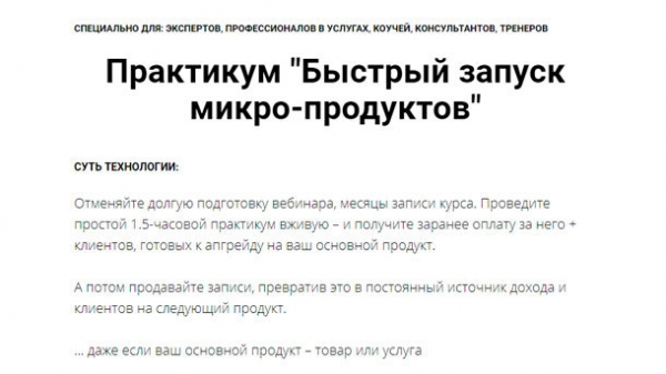 СУТЬ ТЕХНОЛОГИИ: Отменяйте долгую подготовку вебинара, месяцы записи курса. Проведите простой 1.5-часовой практикум вживую – и получите заранее оплату за него + клиентов, готовых к апгрейду на ваш основной продукт. А потом продавайте записи, превратив это в постоянный источник дохода и клиентов на следующий продукт. … даже если ваш основной продукт – товар или услуга ВЫ УЗНАЕТЕ КАК ПРОВЕРИТЬ ИДЕЮ МИКРОПРОДУКТА ЗА ОДИН ДЕНЬ: без платной рекламы, если есть подписчики без каких-либо расходов без громких обещаний без подписчиков вообще, если есть 3000р на таргет … и получить первые продажи, когда идея сработала! ЗА 1,5 ЧАСА ВЫ ПОЛУЧИТЕ: составите список реальных идей микропродуктов для себя получите методику их теста за 1 день – потратив 10 минут времени увидите глобальный 6-шаговый план с 0 до автоматизированного бизнеса узнаете 3 кейса с цифрами расходов-доходов по этой модели 6 простых промо-постов для естественных продаж шаблон простой и эффективной страницы оплаты …и другую помощь в реализации… тсс… сюрпризом будет 🙂
