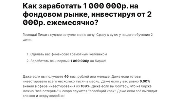 Господа! Писать нудное вступление не хочу! Сразу к сути: у нашего обучения 2 цели: Сделать вас финансово грамотным человеком! Заработать ваш первый 1 000 000р на бирже! Даже если вы получаете 40 тыс. рублей или меньше. Даже если готовы инвестировать всего несколько тысяч в месяц. Даже если у вас ровно 0,00% знаний в сфере инвестирования из 100%. Даже если вы боитесь, что на бирже можно «всё потерять» и скоро случится «всеобщий крах». Даже если всё выглядит сложно и недружелюбно! Обучение всё равно вам подходит — я его разработал СПЕЦИАЛЬНО для новичков и обладателей небольших бюджетов! Цель №2 звучит как-то нереалистично? Я умоляю: миллион — не миллиард, и я не утверждаю, что вы заработаете его через 6 месяцев: я не кот Базилио, и мы не на Поле Чудес монетки закапываем, а обучаемся ИНВЕСТИЦИЯМ, но могу заявить: Если вы изучите все уроки и выполните домашние задания, с вами случатся 3 вещи: 1. Вы полностью разберётесь в устройстве фондового рынка. 2. Вы до конца жизни измените своё отношение к деньгам и научитесь ими УПРАВЛЯТЬ. 3. У вас появится пошаговый план: какие суммы, в какие бумаги, и как долго нужно вкладывать, чтобы заработать заветный миллион? (или 2, 3, 4, 10 млн — зависит от целей). Причём НЕ Я составлю вам план, господа! Вы сами освоите этот бесценный навык и составите план! И сможете составить его для своих детей, родителей, друзей — для кого угодно, потому что этот навык останется на всю жизнь. Как будет проходить обучение? У нас 4 блока, которые состоят из 8 видеоуроков, где я рассказываю (и показываю на слайдах) про инвестиции. В конце каждого урока — домашнее задание, которое вы мне отправляете, я его проверяю и даю обратную связь. Уроки публикуются в закрытом канале. Выходят по очереди (а не сразу вся гора), у вас будет 2-3 дня на изучение каждого и выполнение домашки. Выполнение домашнего задания занимает 15-30 минут. Задания добровольные — если не выполните, то всё равно получите следующий урок, но я крайне рекомендую выполнять их все. Уроки будут доступны для вас ВСЕГДА — вы сможете пересмотреть их в любое удобное время, и даже скачать на компьютер при необходимости. Программа курса: Первый блок. Финансовая грамотность: — Урок №1: Основы финансовой грамотности — Урок №2: Устройство финансового рынка Второй блок. Основы инвестирования: — Урок №3: Фундаментальный и технический анализ — Урок №4: Первый шаг в инвестировании Третий блок: Инвестиционные инструменты — Урок №5: Облигации — Урок №6: Акции — Урок №7: Криптовалюты Четвёртый блок. Инвестиционные стратегии: — Урок №8: Выбор инвестиционной стратегии
