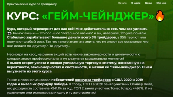 Курс, который перевернет для вас всё! Мне действительно есть чем вас удивить. Рынок акций — это большое легальное казино и вы, наверное, это уже поняли. Стабильно зарабатывают большие деньги всего 5% трейдеров, а 95% теряют или получают слабый рост. Так что такого знает эта элита, что не знают все остальные, что они делают по-другому? По-другому… Несмотря на хаос, на рынке акций есть некие закономерности и цикличности, о которых знают профессионалы и тут результат кардинально меняется! Я вывел секрет успеха и создал уникальную торговую систему, основанную на вероятности, закономерностях и системности, и назвал её “Гейм-чейнджер”. О ней вы узнаете из этого курса. Также я проанализировал победителей конкурса трейдеров в США 2020 и 2019 годов и вывел их формулу победы. К слову, ТОП 1 в 2020 занял участник Оливер Килл, его доходность составила +941.1% за год. ТОП 2 занял участник Томас Кларо, +497%. И на удивление они использовали одну и ту же стратегию! Рассчитываю, что этот курс перевернет трейдинг в России! Что будет на курсе? «Модель F» Моя уникальная торговая система основана на вероятности, закономерностях и системности. Это то, что перевернет ваше отношение к трейдингу и откроет глаза на то, что вообще происходит, позволив вам попасть в те самые 5%,трейдеров, которые стабильно зарабатывают на рынке акций. Секретная формула Вы узнаете формулу успеха победителей конкурса инвесторов США «United States Investing Championship 2020”, которая позволила им заработать +400% +900% прибыли. Oliver Kell, + 941.1%, Tomas Claro + 497%. Оказалось, они все использовали одну и ту же стратегию! Реальная торговля Этот курс наполовину состоит из практики. Вы будете торговать свой портфель используя «Модель F» . Мы с вами выиграем в этом легальном казино под названием «рынок акций”, используя логику профессионалов. Живые уроки в ZOOM Каждый четверг мы будем проводить онлайн-уроки в ZOOM*, на которых будем разбирать вопросы по теории, делиться результатами и торговать акции-суперкары. (Акции-суперкары 2020: $TSLA +1000%, $ZM +400%, $NET +350%). Я уверен, что после курса вы скажете: «Да это магия какая-то! Это реально работает!» Мы не будем искать с вами паттерны, Эллиотта, Фибоначчи, которые каждому человеку кажутся по-разному. Этот субъективный технический анализ НЕ РАБОТАЕТ. Мы будем делать нечто другое… После этого курса вы войдете в 5% успешных трейдеров. И научитесь торговать уверенно! Твой результат: ✓ Научишься понимать рынок и его правила. ✓ Перестанешь поддаваться эмоциям и ошибаться. ✓ Разберешься в инструментах, настроишь свой терминал. ✓ Поймешь как устроен рынок акций и как зарабатывают профессионалы. ✓ Заработаешь первые деньги под руководством профи. ✓ Начнешь стабильно зарабатывать самостоятельно.