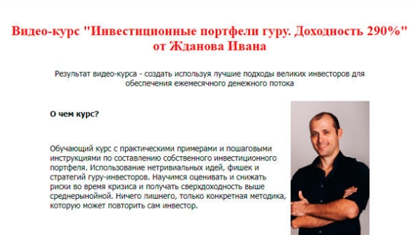 ‍Обучающий курс с практическими примерами и пошаговыми инструкциями по составлению собственного инвестиционного портфеля. Использование нетривиальных идей, фишек и стратегий гуру-инвесторов. Научимся оценивать и снижать риски во время кризиса и получать сверхдоходность выше среднерыночной. Ничего лишнего, только конкретная методика, которую может повторить сам инвестор.   Особенности курса:   1. Структурированная информация Информация дается не только в видео формате, под каждым уроком есть детальное описание понятий, концепций и практических действий по работе с дивидендными акциями. 2. Проверено на учениках Мы создали тестовую группу из учеников других курсов и отработали этот новый курс на них, чтобы максимально решить все вопросы касательно созданию портфелей. 3. Постепенное погружение в каждом видео-уроке Мы реализовали задачу подачи материала в каждом видео-уроке от более простого к сложному, но при этом не уходя в лишние рассуждения и давать только необходимые для применения знания.   Вам необходим этот курс, если вы:   1. Хотите узнать как составляют свои портфели великие инвесторы 2. Нужна пошаговая методика составления портфеля 3. Если планируете создать еще один источник дохода 4. Если хотите структурировать свою информацию и дополнить ее новыми знаниями 5. Хотите снизить риски своих инвестиций   Для кого этот курс:   1. Инвестор Сможете освоить новый способ создания источника дохода без ежедневного отслеживания котировок акций на основании опыта великих инвесторов.   2. Предприниматель Создадите новый актив, который будет генерировать вам дополнительный доход, и на который вы будете уделять минимум внимания.   3. Начинающий Разберетесь с основными концепциями портфельного инвестирования.   Содержание:   1. Вводный урок. 2. Виды инвестиционных портфелей. 3. Инвестиционный портфель Уоррена Баффета. 4. Инвестиционный портфель Карла Айкена. 5. Инвестиционный портфель Билла Гейтса. 6. «Всесезонный» и постоянный портфель Рэя Далио и Гарри Брауна. 7. Инвестиционный портфель Джорджа Сороса. 8. Инвестиционный портфель Чейза Колемана с доходностю 700%. 9. Инвестиционный портфель Дэвида Таппера. 10. Инвестиционный портфель норвежского миллиардера Андреаса Халворсена. 11. Как самостоятельно составить инвестиционный портфель на основе портфелей гуру.   Бонус:   1. Книга Финансовый анализ предприятия с помощью коэффициентов и моделей. 2. Книга Инвестиционная оценка проектов и бизнеса. 3. Книга Прогнозирование доходности и риска инвестиций на фондовом рынке.