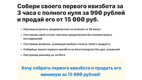 Научишься делать предпроектное на коленке за 30 минут. Составишь своё сочное торговое предложение без километровых исследований. Составишь вопросы, сужающие выбор в пользу твоего продукта. Соберёшь своего первого квизбота на базе Instagram без доп. вложений. Настроишь рекламу на чатбота. Модуль №1. Офферы и понимание клиента Модуль №2. Вопросы в квиз и сборка чатбота в Instagram Модуль №3. Сочный трафик из инсты за вечер с нуля