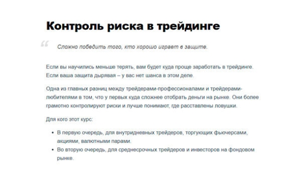 Если вы научились меньше терять, вам будет куда проще заработать в трейдинге. Если ваша защита дырявая – у вас нет шанса в этом деле.   Одна из главных разниц между трейдерами-профессионалами и трейдерами-любителями в том, что у первых куда сложнее отобрать деньги на рынке. Они более грамотно контролируют риски и лучше понимают, где расставлены ловушки.   Для кого этот курс:   В первую очередь, для внутридневных трейдеров, торгующих фьючерсами, акциями, валютными парами. Во вторую очередь, для среднесрочных трейдеров и инвесторов на фондовом рынке.   Прилагается Excel-файл c автоматическими расчетами по фьючерсам, акциям, валютам для вашего пользования в торгах.   В чем польза курса «Контроль риска в трейдинге»:   Даже используя несколько идей из курса, вы сохраните в сотни раз больше денег на протяжении вашей карьеры трейдера, чем заплатите за курс сегодня. Испытаете меньше эмоциональной боли в процессе торговли. Меньше седых волос и депрессий. С более сильной защитой добиться положительного результата в трейдинге станет проще. Поскольку чем меньше вы теряете, тем меньше вам нужно отбивать потери, чтобы перейти к торговле в плюс. Каждое предложение курса-инструкции наполнено смыслом.   Материал изложен доступным для понимания языком.   На изучение понадобится 1-1,5 часа. На обдумывание прочитанного больше.   Вы найдёте материал полезным, даже если вы опытный трейдер.