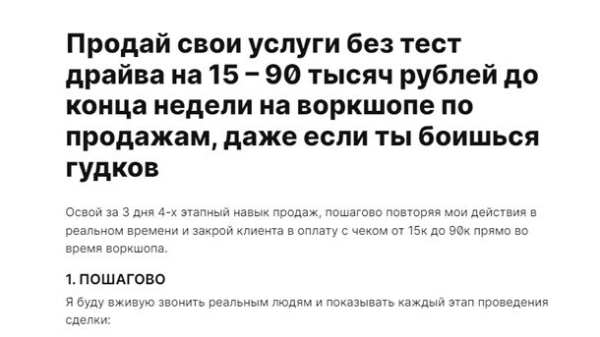 Освой за 3 дня 4-х этапный навык продаж, пошагово повторяя мои действия в реальном времени и закрой клиента в оплату с чеком от 15к до 90к прямо во время воркшопа. 1. ПОШАГОВО Я буду вживую звонить реальным людям и показывать каждый этап проведения сделки: — Закрытие в звонок. — Закрытие в презентацию. — Закрытие в сделку. — Дожим до оплаты. Тебе останется только повторить за мной. Без лишних додумываний. 2. БЫСТРО На воркшопе я покажу технологию продаж без тест-драйва за копейки. Ты научишься в 4 этапа продавать как минимум базовую версию своего продукта. 3. УНИВЕРСАЛЬНО Эта технология продаж универсальна и подойдет для любой фрилансерской услуги с чеком до 90к. Кароче, продашь, даже если до этого не получалось. ПРОГРАММА ВОРКШОПА: 13.01 ДЕНЬ 1 — ПЕРВЫЙ КОНТАКТ Че покажем: Как за 30 минут налидгенить более 30 заявок на свои услуги, потратив на это 500 рублей. 4 техники обхода секретаря/админа. Как за 2 минуты разговора закрывать человека на следующий КЭВ — презентацию продукта. Раздаточные материалы дня: Шаблон сообщения для инструмента по сбору базы. Пошаговый скрипт-сценарий успешного вывода на zoom-call. Результат: Ты научишься за 30 минут заваливать себя 30+ заявками на свои услуги и закрывать не менее 50% из них в презентацию. 14.01 ДЕНЬ 2 — ПРЕЗЕНТАЦИИ Че покажем: Как за 15 минут проведения презентации довести человека до состояния “куда платить?» Как заставить человека САМОМУ сказать то, за что он готов платить деньги? Как сделать так, чтобы на твое предложение невозможно было сказать “НЕТ”?» Как проводить презентацию продукта, чтобы в конце человек попросил выставить ему счет. 4 техники отработки базовых возражений. Раздаточные материалы дня: Шаблон скрипта-сценария проведения успешного zoom-call’a Результат: Ты научишься проводить презентации своего продукта таким образом, чтобы в конце клиент соглашался на сотрудничество и был готов отправить тебе бабки. 15.01 ДЕНЬ 3 — ДОЖИМЫ Че покажем: Как вернуть “потерянных” клиентов? — Тех, кто не отвечает, игнорит, морозится. Как дожимать органично, чтобы клиент охотно отвечал тебе. 3 триггера, которые ускорят перевод средств тебе на счет. Как избежать провала сделки на последнем этапе. Преза личного продукта Никиты. Раздаточные материалы дня: Шаблон сообщения для дожима. Результат: Ты научишься дожимать сделки до оплаты, удерживая инициативу в своих руках и не давая коммерсу слиться. 16.01 ДЕНЬ 4 — БОНУСНЫЙ Че будет: Техника очевидной реальности — Что делать, когда не знаешь, что говорить? Продаем еще дороже: находим тех, кто может платить много+определяем платежеспособность клиента в диалоге. Техники входа в доверие — Как не выглядеть в глазах коммерса классическим манагером-впаривателем. Ответы на вопросы, возникшие в процессе (прям то есть включаешь микрофон и задаешь вопросы, которые у тебя появились). Результат: Часто происходит так, что не добившись результата с первого раза — мы опускаем руки. В этом случае — у тебя просто не будет такой возможности, потому что Никита развернуто разберет твои проблемы и покажет КАК НУЖНО делать.