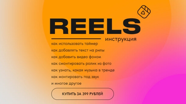 Все, что нужно для быстрого старта! Reels-инструкция: как использовать таймер как добавлять текст на рилы как добавить видео фоном как смонтировать ролик из фото как узнать, какая музыка в тренде как монтировать под звук и многое другое БЛОГЕРАМ Бесплатные подписки и потрясающие охваты даже в маленьких блогах — это все про reels. КОНТЕНТМЕЙКЕРАМ Reels — это самый виральный вид контента в инстаграме. Научитесь снимать и повысьте свой чек. БИЗНЕСУ Освойте reels и рассказывайте о вашем продукте на широкую аудиторию.