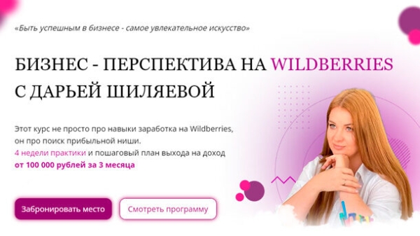 МОДУЛЬ 1. Основы бизнеса на Wildberries   Урок 1 — Как проходить курс, чтобы сделать крутой результат. Организационные моменты. Расписание уроков. Правила прохождения курса. Урок 2 — Знакомство с экспертом: мой опыт на Wildberries. Какие ниши принесли мне миллионную прибыль. Первые ошибки и падения на маркетплейсах. Аналитика моей работы: как нашла прибыльные точки роста. Урок 3 — ZOOM c Дарьей Шиляевой.   МОДУЛЬ 2 — Исследование ниш на Wildberries   Урок 1 — 5 способов найти свою нишу на Wildberries. Авторский метод от Дарьи. Урок 2 — Как интегрировать WB в любой офлайн бизнес и получать дополнительный доход от 500 000 рублей в месяц. Стартовая стратегия. Взаимосвязь офлайн и онлайн бизнеса. Почему Wildberries выгоднее других каналов. Урок 3 — 65 готовых и выгодных ниш для старта на WB. Выберете товары, с которых лучше всего начать. Посчитаете бюджет первой поставки. Научитесь находить «коридоры возможностей. Урок 4 — Регистрация товарного знака. Декларация. Сертификация. Юридические моменты при работе с WB. Чек-лист “Как создать свою уникальную нишу на WB”. Бесплатный способ анализа конкурентов в смежных нишах. Как рассчитать предполагаемую прибыль и не уйти в минус. Какие расходы несет поставщик. Просчитываем бюджет первой поставки.   МОДУЛЬ 3 — Анализируем и считаем   Урок 1 — Детальный анализ конкурентов. Бесплатный способ анализа емкости ниш на WB. Платные способы анализа конкурентов и продаж на WB. Как улучшить свой товар. Урок 2 — Как найти “коридоры возможностей” на WB. Научимся видеть недостатки конкурентов. Просчитывать потерю денег поставщиков. Поймем, как чужие ошибки превратить в свою прибыль. Урок 3 — Бизнеса-математика на Wildberries. Бонус: Таблица расчета цен и прибыли на Wildberries. Список платных сервисов для аналитики на Wildberries.   МОДУЛЬ 4 — Производство и продажа готового товара   Урок 1 — Разбор готовых товаров: все плюсы и минусы. Поймете, какой способ выгоднее для вас. В какой стране закупать товар. Разберем ошибки новичков. Урок 2 — Производства в России. Урок 3 — Закуп товара в Китае. Урок 4 — Закуп в Турции, ОАЭ, Италии. Урок 5 — Идеи ниш для собственного производства. Как выделиться на рынке в 2022 году. Отшивать коллекцию или один товар. Закупка тканей по выгодным ценам.   МОДУЛЬ 5 — СТАРТ НА WILDBERRIES   Урок 1 — Оформляем первую поставку на Wildberries. Правила упаковки товара. Оформление поставки. Учимся делать поставки по системе FBS и FBO. Урок 2 — Упаковка и маркировка товара. Как избежать потери товара на складе. Варианты доставки товара до склада WB. Зоны покрытия складов WB. Урок 3 — Продающий визуал в карточке товара. Видео, фотографии и 3D фото. Инфографика в товарах. Как передать смысл через фото. Урок 4 — Работа с отзывами. Урок 5 — Работа по системе FBS и FBO.   МОДУЛЬ 6 — Система “Запуск + товарный бизнес”   Дарья Шиляева — автор и ведущая курса по заработку на Wildberries. Основательница бренда одежды LADY LOOK. 12 лет создает собственный бизнес в офлайне. Владелица двух фабрик общей площадью более 600 м². Успешный продавец на WILDBERRIES в четырех прибыльных нишах. Аналитик и стратег по выходу на миллионные обороты в бизнес. Автор курса «бренд одежды с нуля». Консультант торговой федеральной сети по Wildberries. Основатель двух фабрик по пошиву одежды. Открыла розничную сеть офлайн магазинов и франшиз от Москвы до Южного Сахалина.