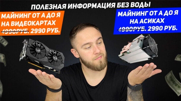 Видео-курс «Майнинг от А до Я» на видеокартах или асиках.   Данный курс подойдёт тем кто хочет начать зарабатывать на майнинге но не понимает как и что делать.Все те знания которые я получил за долгое время что я занимаюсь майнингом я решил уместить в этот курс.Там нет лишней и ненужной информации, лишь то что пригодится в дальнейшим, и очень много информации для новичков.   Видеокарты: 1.Введение. Что такое майнинг? 2.Как составить бизнес план. 3. Оборудование. 4. Подготовка помещения для майнинга. 5. Сборка. 6. Какое ПО выбрать. 7. Пул, кошелек и вывод средств. 8. Настройка оборудования. 9. Уход за оборудованием. И другие важные темы.   Асики: 1. Введение 2. Как выбрать и где купить асики. 3. Расчет. 4. Тестирование. 5. Электрика. 6. Помещение. 7. Подключение. 8. Чистка. 9. Вывод средств. 10. Прошивка. 11. Заключение.