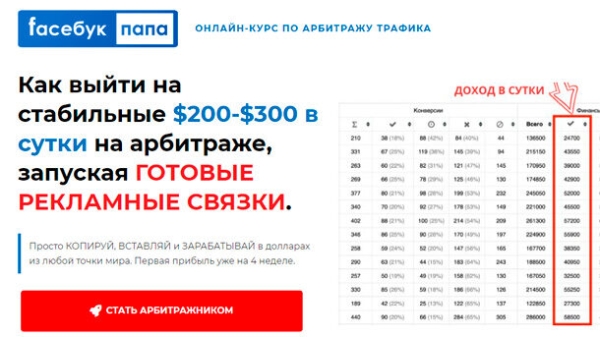 Для кого курс?   Курс создан для НОВИЧКОВ и МАРКЕТОЛОГОВ, которые хотят освоить одно из самых прибыльных направлений интернет-маркетинга — АРБИТРАЖ ТРАФИКА.   Что такое арбитраж? Арбитраж — это банкомат, в который ты вкладываешь 100$, а вытаскиваешь 200$. Арбитраж — это покупка и перепродажа клиентов.   К примеру, ты выбираешь какой-нибудь оффер/товар/услугу (например, парфюм или робот-пылесос). Настраиваешь на него рекламу и получаешь заявки. Рекламодатель тебе платит [условно] 12$ за одну заявку. А ты покупаешь эти заявки в рекламном кабинете по 5$. Получается, 12-5=7$ твоя прибыль с каждой заявки. Таким образом, ты можешь генерировать хоть 10 заявок в день, хоть 100.   ЗАПУСКАЙ НА КУРСЕ УЖЕ ГОТОВЫЕ СВЯЗКИ…   ГОТОВЫЕ СВЯЗКИ — САМЫЙ ПРОСТОЙ ПУТЬ К БЫСТРЫМ ДЕНЬГАМ!   Шаг 1. Теория. Ты проходишь теоретическую часть курса и получаешь навык монетизации трафика. Запускаешь рекламу, клики превращаешь в заявки, а заявки превращаешь в деньги.   Шаг 2. Готовая связка. Наша команда выискивает готовые актуальные рекламные связки, которые уже успешно проливаются другими арбитражниками, и выдает их тебе.   Шаг 3. Money Making. Тебе остается лишь подготовить аккаунт, настроить сайт и запустить рекламу. Прибыль нужно реинвестировать обратно в рекламу и быстро наращивать обороты.   Шаг 4. Схема Хитрого Билли. Секретная схема позволяет буквально делать деньги из воздуха. Ты можешь вовсе не платить за рекламу, тогда все деньги за лиды будут твоей чистой прибылью.   Вот чему ты обучишься?   Модуль 1. Скучное Введение в Арбитраж. Получишь твердый фундамент в арбитраже. Разберешься в терминологии, зарегистрируешься в лучших CPA-сетях, познакомишься с личным менеджером и заведешь себе платежку для приема оплат.   Модуль 2. Я у мамы программист. Ты полностью научишься работать с сайтами: работа с доменами, хостингом, проксирование сайта через клауд, парковка доменов к сети, скачивание, установка и редактирование html-кода лендингов и прокладок с ПП, клоакинг сайтов.   Модуль 3. Креативный маньяк. Научишься находить прибыльные связки и создавать на их основе собственные креативы, которые будут приносить лиды по дешевой цене.   Модуль 4. Анонимность в интернете. Научишься обходить АНТИФРОД системы, так что ФБ перестанет блокировать при переключении между множеством аккаунтов. Разберешься с прокси серверами и антидетект браузерами.   Модуль 5. Faceбук мания. Полная схема работы с ФБ, от покупки аккаунта до запуска рекламы и обхода блокировок.   Модуль 6. Схема Хитрого Билли (доступно только в пакете PRO). Секретная схема, которая использует уязвимость системы ФБ для добычи условно бесплатного трафика. 200$ рекламного бюджета можно добыть, потратив ±10$ на расходные материалы и 1-2 часа времени.   Модуль 7. Готовые связки (доступно только в пакете PRO). Ты добавляешься в закрытый телеграм-канал, где будут выкладываться рабочие связки в формате КРЕАТИВ+САЙТ. Тебе останется лишь загрузить эту связку в рекламный кабинет и считать свою прибыль. Изначально ты добавляешься на 3 месяца, но при выполнении определенных условий, ты остаешься в канале навсегда.   Модуль 8. Кнопка «Бабло» (доступно только в пакете PRO). Секретная партнерская программа, которая позволяет зарабатывать по 100-200$ с одной заявки, потратив 15-30 минут времени и 0$ вложений.   Модуль 9. КЛОАКИНГ-сервис на 2 года. (доступно только в пакете МЕНТО