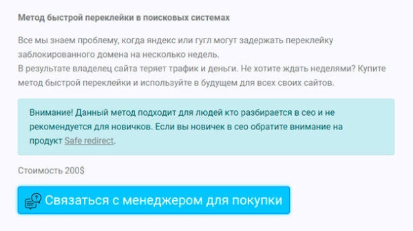 Все мы знаем проблему, когда яндекс или гугл могут задержать переклейку заблокированного домена на несколько недель. В результате владелец сайта теряет трафик и деньги. Не хотите ждать неделями? Купите метод быстрой переклейки и используйте в будущем для всех своих сайтов. Внимание! Данный метод подходит для людей кто разбирается в сео и не рекомендуется для новичков.