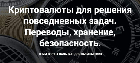 СЕМИНАР “НА ПАЛЬЦАХ” ДЛЯ НАЧИНАЮЩИХ Это базовый семинар для начинающих, обучающий пользоваться криптоденьгами уверенно и максимально безопасно. На семинаре будет понятный общий обзор для того, чтобы быть знакомым с темой криптовалют. Затем будут даны разъяснения очень конкретных практических задач: кому подходят финансовые операции с помощью криптовалют, с чего начать, как попробовать, как отправить деньги и получить наличные в другой стране, что изучать дальше. Предварительная программа: Блокчейн и криптовалюты, как это вообще работает. Цифровые аналоги доллара США. Анонимность и неанонимность. Переводы и выводы небольших сумм. Крипта “в быту”. Крупные суммы и общие принципы регулирования. Хранение. Кошельки. Биржи. Безопасность и риски. И пара слов о будущем 🙂 Бонус: подборка открытых проверенных инструкций из сети, как зарегистрироваться на биржах, как пошагово сделать перевод и как создать анонимный кошелёк. На семинаре мы не будем проходить регистрации или делать отправку онлайн. Это останется для самостоятельной практики, по желанию. Инструкции и знания с семинара вам в этом помогут.