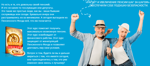 ЗАГАДОЧНАЯ ОРГАНИЗАЦИЯ Многие пытаются увеличить свою пенсию, полагаясь только на себя. Это долго и трудно. Пенсионные формулы напоминают детскую загадку-дурилку: «загадай число, прибавь, отними, умножь, раздели…». А ответ заранее известен Пенсионному Фонду. Догадайтесь, почему он скрывает свои расчёты? Потому что, если бы все пересчитали свои пенсии, то Пенсионному Фонду пришлось бы раскошелиться на миллионные выплаты. И получается уже дурилка для взрослых, год за годом теряющих деньги. ВЕЧНЫЙ ВОПРОС «ЧТО ДЕЛАТЬ?» Самое главное, чему учит курс — понимать логику начисления пенсии и то, какие законы, правила, причины заставят вашу пенсию вырасти до максимального размера. В результате чего Вы: Избавитесь от манипуляций Пенсионного Фонда Пересчитаете и увеличите свою пенсию Откажетесь от судов и юристов Попадёте в число тех, кто доволен своей пенсией ПОСМОТРИТЕ, — КАК ЭТО РАБОТАЕТ На самом деле увеличить пенсию проще, чем кажется. Всё сводится к одному действию: найти точку где ПФР провёл неправильный расчёт, и поймать его на ошибке. Вопрос в том, как её найти? Можно действовать самостоятельно и потратить на поиск месяцы. А можно воспользоваться методикой видеокурса. Она точная, простая, понятная, и эффективная. И самое главное на 100% рабочая. Случай из практики «Недополученная пенсия» У Галины Сергеевны в пенсионном деле 2 справки о зарплате. Сначала пенсию начисляли по одной, а затем стали считать по другой. Почему? Оказалось, что ПФР выбрал наиболее «экономный» вариант. Расчёт показал недоплату в 52 рубля. Но она возникла в 2000 году, поэтому недополученную пенсию нужно было рассчитать вплоть до 2016 года с учётом ежегодной индексации. 52 рубля превратились к 2016 году в 129 000 рублей! В Пенсионном Фонде «сильно удивились». Пересчитали. И недоплата действительно составила 129 000 рублей. Согласитесь, неплохая прибавка к пенсии. Можно положить в банк, съездить в путешествие или помочь детям. Вариантов масса! Кстати, Галина Сергеевна сделал ремонт. Почувствовали разницу? ДЛЯ КОГО ЭТОТ КУРС ДЛЯ ТЕХ, КТО СОБИРАЕТСЯ НА ПЕНСИЮ Это идеальный для вас вариант. Курс поможет сразу получить максимально возможную пенсию. Без навыков расчёта вы просто потеряете деньги, либо в борьбе с Пенсионным Фондом потерпите поражение. ДЛЯ ТЕХ, КТО ПЫТАЕТСЯ САМ УВЕЛИЧИТЬ СВОЮ ПЕНСИЮ Чем больше опыта у вас за плечами, тем больше отдачи вы получите от курса. Буквально с первых минут занятий увидите все свои ошибки, поймёте их и больше не допустите. ДЛЯ ТЕХ, КТО СОМНЕВАЕТСЯ В НАЧИСЛЕНИЯХ ПФР Вы считаете, что ПФР урезал пенсию, но доказать не можете. После курса вы быстро поймёте, куда делись ваши деньги, и заберёте всё, что вам полагается. СКОЛЬКО Я СМОГУ ПОЛУЧИТЬ? Все пенсионные случаи можно условно поделить на две большие категории: до пенсии и после пенсии. Если пенсия ещё впереди, то с помощью курса вы легко сможете её увеличить в 2 раза. А кто-то даже больше. Если вы уже на пенсии, то плюс к её ежемесячному увеличению вы ещё сможете забрать всю недополученную пенсию с момента её назначения. Чем больше лет прошло, чем больше было пропущенных индексаций, тем больше будет отдача. Вы же видели, как 52 руб. выросли в 129 000 руб. А теперь представьте, какая сумма скопилась, если ваша недоплата составляет, скажем 1000 рублей? Предела нет. Конечно, пенсионные ситуации у всех разные и масштаб