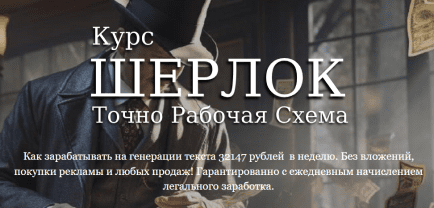 Что Вы получите при покупке курса ‘ШЕРЛОК’ — ТОЧНО РАБОЧАЯ СХЕМА + Подарок от Шерлока   Полная обучающая программа по работе схемы Обучение в видео формате Дополнительный файл с сервисами Доступ с любого устройства к схеме в любое время Помимо основной схемы заработка, Вы получите проверенный Дедовский метод. Очень простой и очень надежный. Который поможет в разы больше зарабатывать. Самый главный принцип схемы Шерлок — это честность и прозрачность способов заработка. И этот подарок, как и сам курс полностью отвечают высоким стандартам открытости. Все очень просто. 1 — Вы познакомитесь с списком сервисов “Шерлок”, который получился исходя из опыта двух лет работы по этой схеме. Без этих инструментов невозможно запустить схему. Это заслуга опыта и главная ценность курса. 2 — Вы зарегистрируетесь в специальном сервисе, который будет принимать от Вас сгенерированный текст по системе “Шерлок”. 3 — Вы получаете ежедневные уведомления на почту о Вашем балансе и сколько Вы заработали на своих сгенерированных текста по схеме “Шерлок”. Очень Важно: Каждый день Вы будете получать такие письма, даже если Вы этого не хотите, отказаться нельзя. Сервис обязуется Вам об этом сообщать.