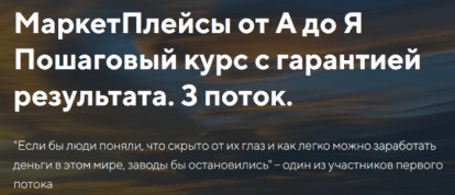 Бизнес на простой схеме   Не нужно уметь настраивать трафик, не нужно уметь продавать, не нужно общаться с клиентами. Не волшебная таблетка, но это очень простой способ заработка!Возможность найти работу Если ты ищешь работу, то уже во время курса ты сможешь пройти стажировку и на выходе устроиться в действующий бизнес, взяв на себя функции продвижения на маркетплейсах. Зарплата огонь! 1. Вводное занятие. Обзор маркетплейсов и их бизнес моделей. Знакомство с ключевым функционалом. 2. Подключение к площадкам. Регистрация и настройка. Кто может продавать? Какую модель работы выбрать? Знакомство с платформой и функционалом. Юридические нюансы, ИП, банки. 3. Выбор ниши. Исследование рынка товаров. Сервисы аналитики. Как выбрать товар на миллионы? Какие товары точно нет. Возможные нюансы по работе с поставщиками. Где покупать товар. Где взять деньги если их нет. Когда нужен Китай и другие нюансы. 4. Физическая упаковка товара, правила, сертификация документов. 5. Работа с дизайном и контентом. Воронка продаж на маркетплейсах. Как сделать из серой карточки продающую. 6. Маркетинг и инструменты продвижения. Инструменты внутренней/внешней рекламы 7. Команда. Самые важные люди. Как научиться нанимать тех самых. 8. Управление и масштабирование. Как сделать х10. Правила взрывного роста. Метрики управления, дашборды, управление ростом через цифры. Привлечение инвестиций. Оптимизация налогов. Работа с банками на больших оборотах. 9. И не только…Курс в формате «до результата», поэтому ты внедришь все что нужно для результата. 10. А дальше самое интересное…