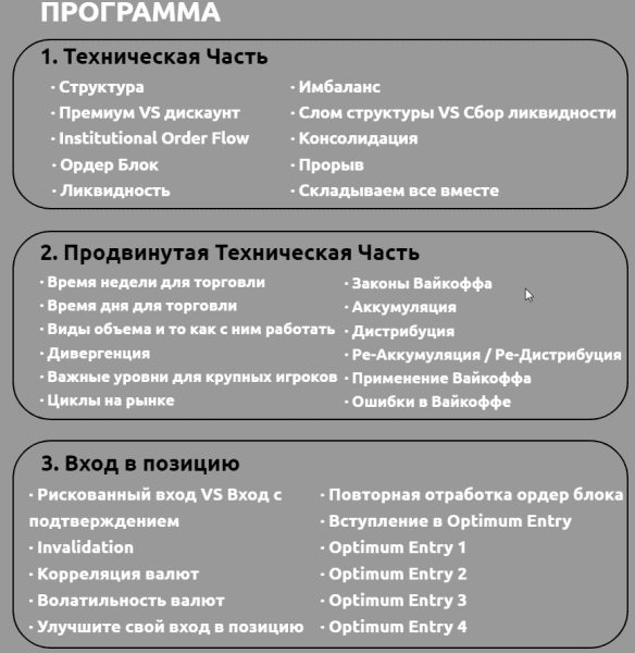 Что ты узнаешь? 50 Видео уроков ( 5 Разделов от самой базы SM до самых малозаметных нюансов) 10 Часов видео уроков · Обновление обучения — каждый, кто приобрел тариф, получает доступ ко всем новым урокам 22 Домашних задания · Только практика на графике · Ответы в записи общей длинной более 7 часов ЧЕМУ ВЫ НАУЧИТЕСЬ? · Вы научитесь анализировать все виды активов, будь то акции, индексы, форекс, крипто, металлы и иные товары, так как стратегий Smart Money применима ко всем рынкам · Не ожидайте фантастических и нереальных на постоянной основе 50% в месяц, но при соблюдении риск менеджмента и при ответственном подходе к стратегии, Вы увидите достойные результаты. Единственное что нужно — перешагнуть черту стабильности, а дальше куда проще! · Самое главное, Вы поймете, когда не нужно входить в позицию, так как вы составите свой торговый план, Вы будете входить не в спонтанные, а в четко установленные позиции.